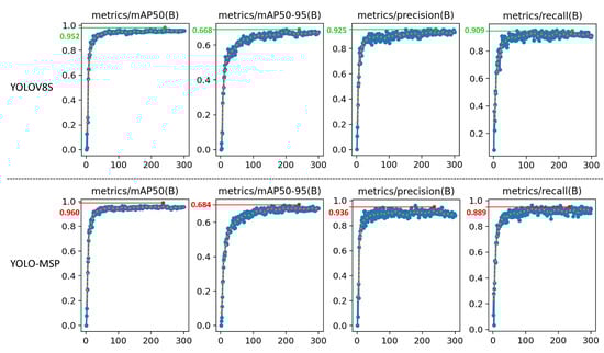 Training indicator trend chart of YOLOV8S and YOLO-MSP. The horizontal axis represents the number of training iterations, and the vertical axis represents the corresponding indicator value. The figure from left to right shows average precision (mAP@0.5 and mAP@0.5:0.95) and recall rate (precision/recall).