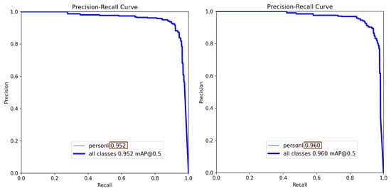 We plotted the precision–recall (P–R) of YOLOV8S and YOLO-MSP and the comparison curves of map@0.5 and mAP@0.5:0.95. Through these images, we can intuitively observe the process in which various indicators of the model gradually stabilize and improve as training proceeds. Among them, the YOLO-MSP precision–recall (P–R) improvement is more significant, and the map value is higher than that of YOLOV8S. The left side of the picture is the YOLOv8S model, and the right is the YOLO-MSP model. The images are shown in Figure 9 and Figure 10, respectively.