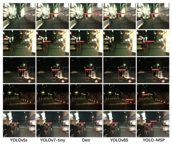The recognition frame results of different algorithms on the KAIST public data set, from left to right, are the YOLOv5s, YOLOv7-tiny, Detr, YOLOV8S, and YOLO-MSP.