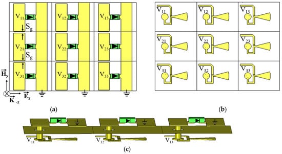 The unit cell’s front-side, back-side, profile, and 3D inside view are shown in Figure 1a–d, respectively. The unit cell comprised two commercial dielectric substrates of Rogers company (Chandler, AZ, USA) model RT/Duroid 4350B with a low dielectric constant of εr = 3.66 [25]. Prepreg RO4450F (Rogers company, Chandler, AZ, USA) was used to glue them together. Two vertical conductor strips were in the top layer, and the varactor diode was placed between them, as shown in Figure 2a. Varactor diode model MAVR-011020-1411 of MACOM (Lowell, MA, USA) was used in this unit cell design since it provides an extremely low capacitance, enabling a wide dynamic capacitance range. The varactor diode capacitance Cd is between Cmax = 0.22 pF and Cmin = 0.035 pF for 0–15 V reverse bias voltages, respectively, providing a capacitance ratio of 7 [26].