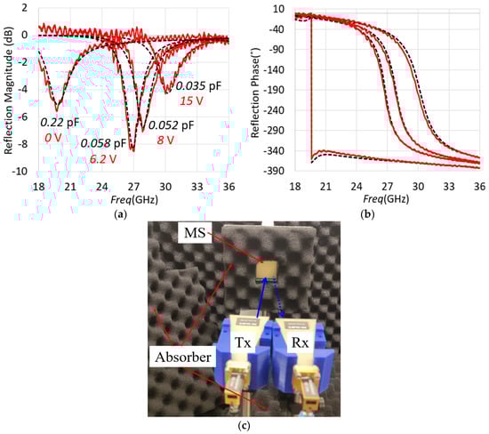 The TEM floquet port of CST 2023 simulation software [28] was used to analyze the proposed unit cell’s reflection. Figure 3 shows the CST simulation results compared to the reflection measurements of the designed unit cell. The comparison was measured for different capacitance values of, Cd, determined by the reverse bias voltage, Vd. The experimental setup is shown in Figure 3c.