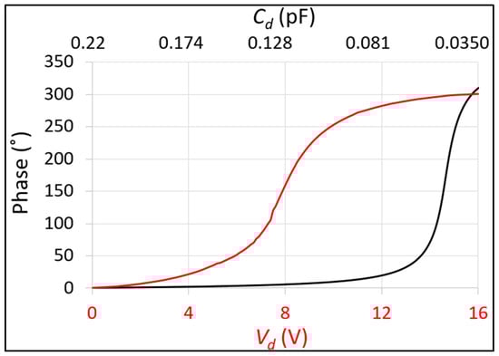 The reflected phase dynamic range of the unit cell at a frequency of 28 GHz is a function of the varactor capacitance Cd in the black line (simulation results) and a function of the varactor reverse voltage Vd in the red line (experimental results).