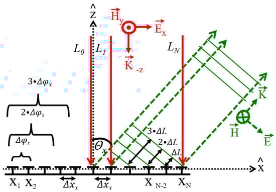 Figure 5 shows a reconfigurable MS reflector scheme. L1, L2, and LN are incident rays towards the surface. Due to a planned gradual phase provided by the unit cells’ MS reflector, the rays are reflected at the desired angle . The Optical Path Difference (OPD) between the cells is defined as ΔL [9] and is shown in Equation (1)