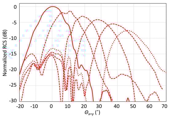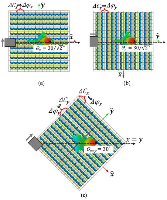It is necessary to pay attention to the MS orientation, which changes between Figure 6a,b by 90° degrees, and between Figure 6c by 45°. The combined beam steering on the axis and the axis simultaneously allows for the 2D beam steering, as shown in Figure 6c. This leads to the beam steering angle at θx=y = 30°, following Equation (4).