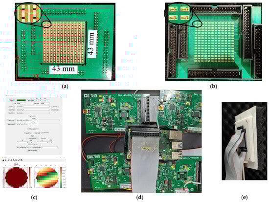 Photo of the manufactured MS prototype: (a) front side; (b) backside; (c) GUI panel with an example; (d) microcontroller and DAC channels; (e) cables with 192 DC channels connected to the back side of the MS reflector.