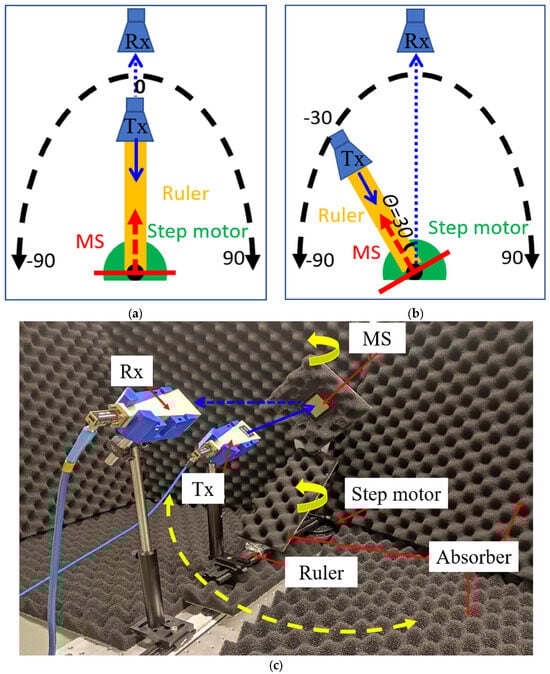 Far-field measurement setup: (a) scheme for sample acquisition θr = 0°; (b) scheme for sample acquisition θr = 30°; (c) A photo of the far-field K-band experimental setup. The yellow dashed arrows show the path of the Tx antenna, which moves along with the MS. The solid yellow arrows indicate the direction of the stepper motor’s motion. Consequently, the MS is positioned at the center of the Tx antenna’s circular trajectory.