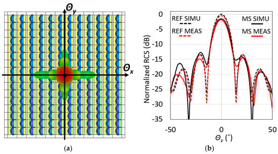 Figure 10b shows the far-field simulation and measurement results of the MS for the case of a uniform reflected phase for all unit cells (θr = 0°) compared to the reference copper plate of the same size as the MS.