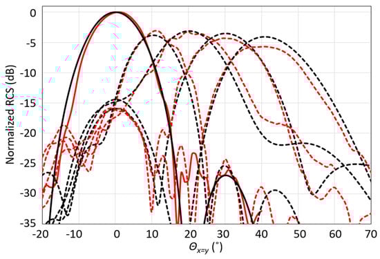 The 2D far-field results at 28 GHz: simulation results in black, and measurement results in red; the two solid lines are for θr = 0° for the reference, and the dashed lines are the results for steering angles 10°, 20°, and 30°, and 40° on the spatial oblique cut, where X = Y.