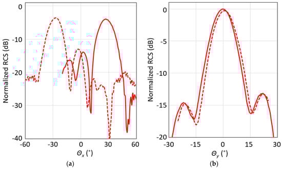 The 1D far-field beam steering results at 28 GHz. (a) The negative angle beam steering result represented by the red solid line is compared to the same θ angle’s positive beam steering result, represented by the red dashed line, at the θx coordinate. (b) The beam steering result at θ = 1°, represented by the red dashed line, is compared to the reference result θ = 0°, represented by the solid red line, at the θy coordinate.