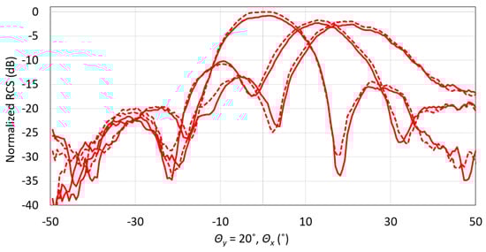 Figure 14 compares the typical case, where each unit cell is connected to a separate DC voltage (dashed line), to the four UBC cases (solid line) at 28 GHz. The experimental results were in excellent agreement in both cases and showed the high feasibility of using UBC algorithms for MS.