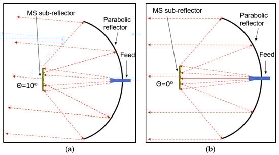 Basic Cassegrain antenna diagram with flat MS as a sub-reflector: (a) without beam steering (θ = 0°); (b) with beam steering (θ = 10°). The dashed red arrows indicate the radiation path from the antenna feed to the sub-reflector and then to the parabolic reflector. Beam steering from the parabolic reflector can be achieved by steering the beam at the sub-reflector.