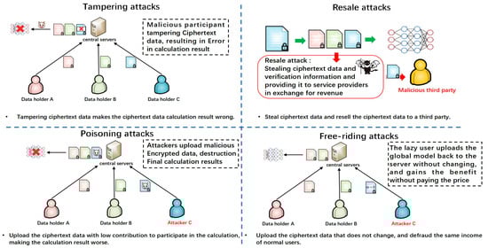 The deployment of 6G inherent security mechanisms ensures the confidentiality of 6G user data. However, the protection of data confidentiality makes data invisible, which is a double-edged sword, as it can lead to new security risks when multiple parties collaborate in analysis. As a new open-application network, 6G networks coexist with trusted, semi-trusted, and malicious 6G users, who are likely to exploit the invisibility of encrypted data to attack the collaborative analysis process. The following are four typical encrypted data attacks that this framework aims to defend against, as illustrated in Figure 2