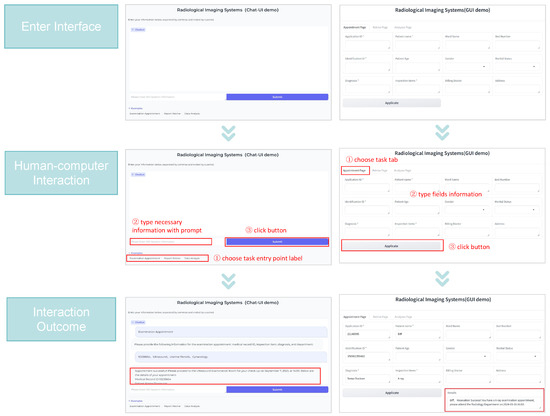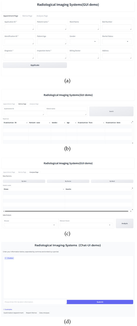 We chose examination appointment, report retrieval, and data analysis, which are the main modules of the RIS, as the focus of our prototype implementation. The prototype integrates both a GUI and a ChatUI for comparison. The GUI interface consists of three panels for each functionality, designed to resemble a real RIS. Extra buttons were removed, and only necessary components were retained, so as to streamline the user experience in GUI. Figure 2a–c illustrates the GUI interface of our prototype implemented for the user study. In contrast, the ChatUI interface features all functions with a unified interface, with a design inspired by ChatGPT (https://openai.com/blog/chatgpt/ (accessed on 1 May 2024)).