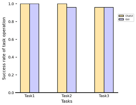 Success rate of task operation using ChatUI and GUI interfaces. The graph compares the performance of ChatUI and GUI for three different tasks. The success rate is consistently high for both interfaces across all tasks, demonstrating the feasibility of using ChatUI for RIS operations.