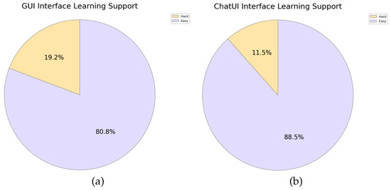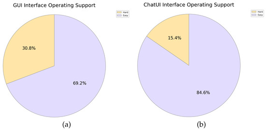 User evaluation of operation support for GUI and ChatUI interfaces. The majority of subjects (84.6%) found the ChatUI interface more convenient to operate, while 69.2% of subjects reported being more proficient in operating the GUI interface. These results suggest that the ChatUI interface provides a more user-friendly experience, despite users’ familiarity with traditional GUI interfaces. (a) Evaluation of the GUI interface operating support. (b) Evaluation of the ChatUI operating support.