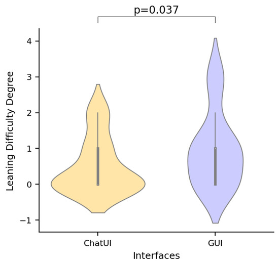 Comparison of learning difficulty between ChatUI and GUI interfaces. The ChatUI interface, which guides users to learn function logic through agent prompting, demonstrates a significantly lower learning difficulty compared to the GUI approach. This result supports the hypothesis that the chat interface can facilitate an easier understanding of RIS function logic.