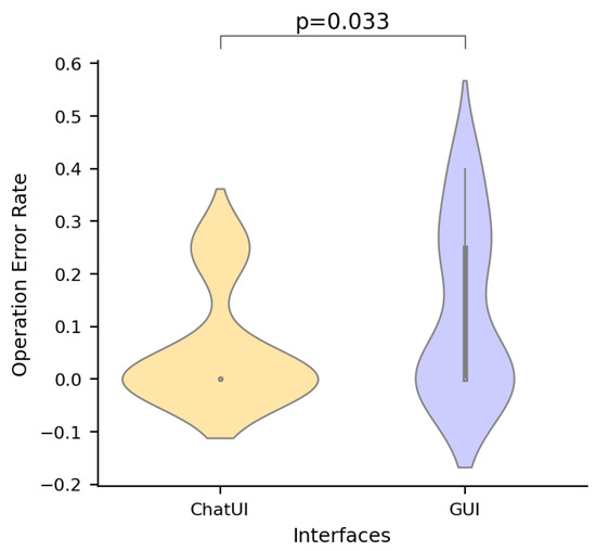 Comparison of operation error rates between GUI and ChatUI interfaces. The GUI interface exhibits a significantly higher operation error rate compared to the ChatUI interface when multiple operations are required.