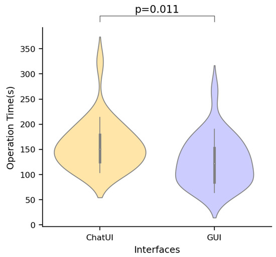 Comparison of operation times between GUI and ChatUI interfaces. Subjects spent more time operating the ChatUI interface compared to the GUI interface. However, this longer operation time is attributed to network latency caused by accessing OpenAI’s API, rather than inherent usability or efficiency issues with the ChatUI interface itself. The operation time difference is a consequence of the specific network conditions during the experiment.