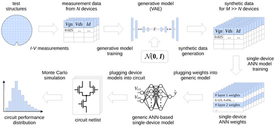 The trained model can then be used to generate data of this kind in much larger quantities (thousands or more) than the size of the training set (under a hundred). This procedure can be seen as a case of data augmentation, where a small set of real data is used to generate synthetic data points to build a dataset large enough for a given application (see, e.g., [15,16]). Since each data point is just a vector of discrete samples for a single device, an ANN-based model must be subsequently fitted to those samples to produce a continuous representation of the device’s I-V curves for Spice simulation. The entire workflow is shown in Figure 1.