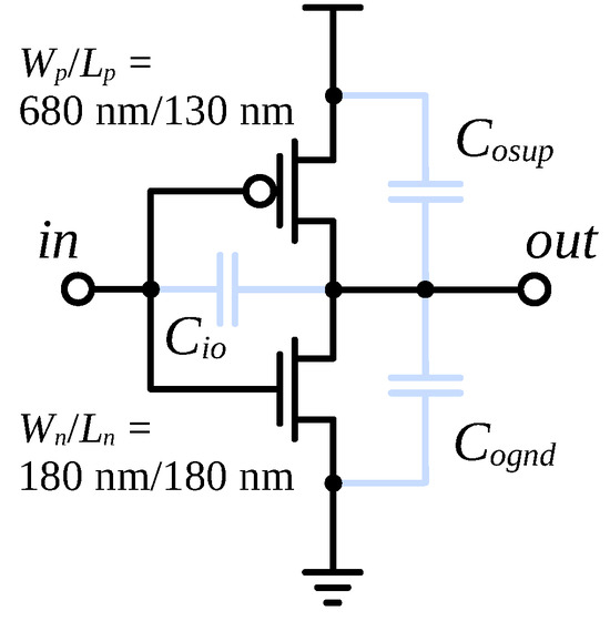 Two Monte Carlo experiments were conducted on such ring oscillators. In the reference simulations, the BSIM 3v3 MOSFET model was used [22]. Then, it was replaced by ANN-based generated models. The model generation details are given in the subsequent subsections. Since the current version of the generative model only produces I-V data but not yet the C-V data, the ANN-based models had to somehow use the same terminal capacitances as BSIM models for fair comparison of dynamic properties of both models. To this end, the voltage-dependent BSIM capacitances had to be replaced with such fixed values as to assure the same oscillation period. The network of fixed capacitances used in each inverter is shown in Figure 5.