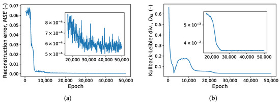 (a) VAE reconstruction error and (b) Kullback–Leibler divergence (KLD) on the validation dataset evaluated in the training phase every 100 epochs. The insets show that the KLD saturates after approximately epochs, while the reconstruction error takes approximately twice as long to reach its minimum.