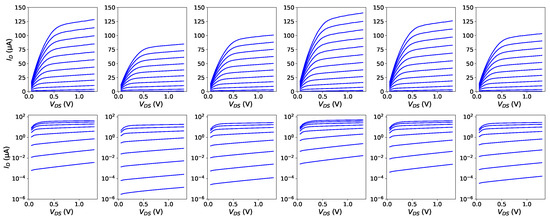 Figure 7 shows example I-V curves generated by a VAE trained on a dataset of 50 devices and subsequently stimulated with six standard normal vectors. The curves are qualitatively similar to actual MOSFET curves (presented in Figure 4a) both on the linear scale (top row) and logarithmic scale (bottom row). Ripples are very small and are further smoothed out at the next stage, where ANN-based approximation models are fitted individually to the I-V curves of each device (see the following Section).