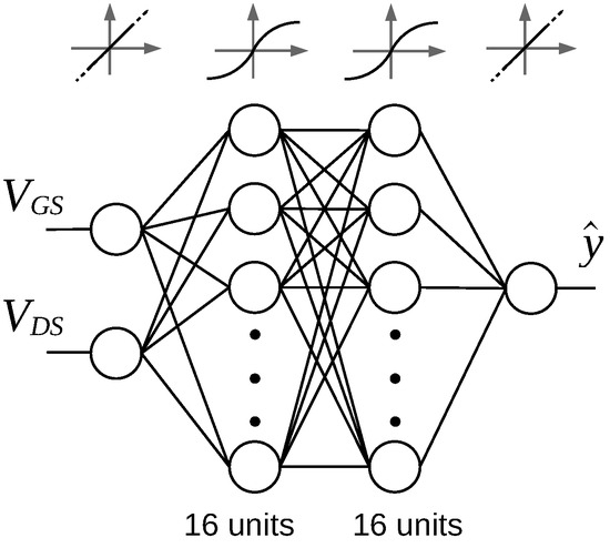To circumvent this limitation, a number of parametric approximation models have been proposed that take into account the actual values of disturbed process parameters. Such models require training, i.e., their internal parameters must be optimized so as to make the model general enough to correctly reproduce the I-V curves of any device as long as the process perturbations are contained within a given range. The model introduced in [8] is fitted to I-V data for the nominal device as well as to all “corner” devices, i.e., ones having one process parameter assuming its minimum or maximum value. I-V curves for other devices can then be obtained by interpolating between those extreme cases. This interpolation is done on a linear scale above the threshold voltage and on a log scale in deep subthreshold. In moderate inversion, the weighted average of these two approaches is used. In [9], a lookup table–based model is provided for the nominal (i.e., deviation-free) device, while the I-V curves of disturbed devices are obtained by transforming the output of this nominal model with highly nonlinear functions of and . The parameters of those nonlinear functions are assumed to be linear or quadratic functions of the process-parameter deviations. Once the coefficients of those linear and quadratic functions are identified, it is very easy to reproduce I-V curves of a device, as long as the actual values of disturbed process parameters are known for this device. The authors of [10] use an artificial neural network (ANN) to model the behavior of a nanosheet FET. The network’s inputs include, apart from the device’s terminal voltages, also selected design and process parameters like gate length or nanosheet thickness. A similar approach has been adopted in [11]. The most conceptually advanced works use ANNs known as autoencoders (a brief description of this architecture can be found in Section 2) to learn the nonlinear relationships between selected process parameters and I-V curves of p-i-n diodes [12] or I-V and C-V curves of FinFETs [13].