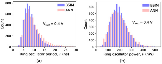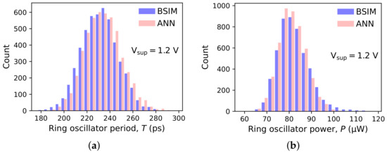 Two experiments were run, differing in the ring oscillator supply voltage. In the first experiment, the nominal supply voltage for the 130 nm MOSFET node V was used. In the other, was reduced to V, which corresponds to devices operating slightly above the threshold voltage or, for strong positive deviations in , in subthreshold (see Table 1 for mean values and standard deviations of ). A total of 5000 ROs were generated in either experiment, each with unique ANN-based models of n-channel and p-channel devices. By way of reference, another 5000 ROs were simulated with BSIM models. Histograms of the RO period and power consumption are presented in Figure 9 ( V) and Figure 10 ( V).