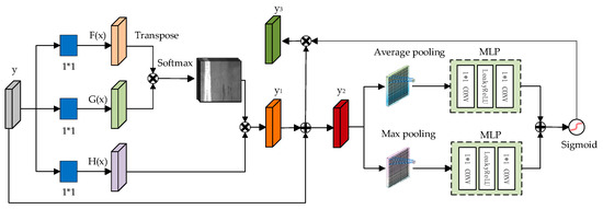 where S is the activation function, VAtt represents the attention computation, F(x) and G(x) are the feature vectors utilized for computing the attention weights, and M(x) denotes the input feature vector. Subsequently, we employ mean pooling and maximum pooling techniques to compress the spatial dimension of the feature map y2, generating a one-dimensional vector. Subsequently, this one-dimensional vector is then forwarded to a multilayer perceptron (MLP), which consists of a 1 × 1 convolutional layer, a LeakyReLU activation function, and a 1 × 1 convolutional layer. Finally, the results derived from parallel processing through the average pooling layer and the maximum pooling layer are weighted and summed. Subsequently, the feature map is generated by applying the Sigmoid activation function and multiplying it with y2 to obtain y3. The computed feature map y3 is shown in Equation (2).