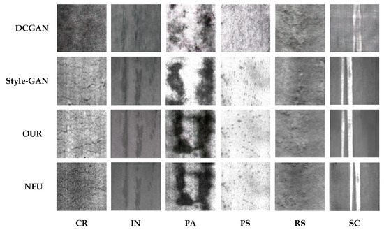 When observing Table 1, we can see that our algorithm achieves a significant improvement under all six types of labels in the comparison results of the images generated from the NEU dataset. The reduction in FID values ranges from 10% to 20% relative to DCGAN and Style-GAN. Among them, the improvement is most evident under CR labeling, where our algorithm achieves an FID value of 76.3, compared to the values of 229.7 and 96.4 for DCGAN and Style-GAN, respectively. Furthermore, our algorithm achieves a greater improvement of 29% under SC labeling, followed by significant improvements under all other labels; for the indicators of IN, PA, PS, and RS, the OUR model improved by 32%, 53%, 63%, and 61% compared with the DCGAN model, respectively.