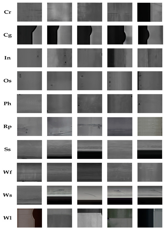 Analyzing the images generated in Figure 3 and Figure 4, the results show that after 200 epochs of training, the OUR model’s results are overall better, and the OUR-type images are intuitively closer to the original dataset, which suggests that the model performs well in capturing the core features and details of the dataset. It also exhibits greater similarity to the original dataset in terms of texture and local features. However, the features are not prominent on Cr and Ss types, which can be attributed to insufficient training samples, thereby resulting in poor model performance because of overfitting.