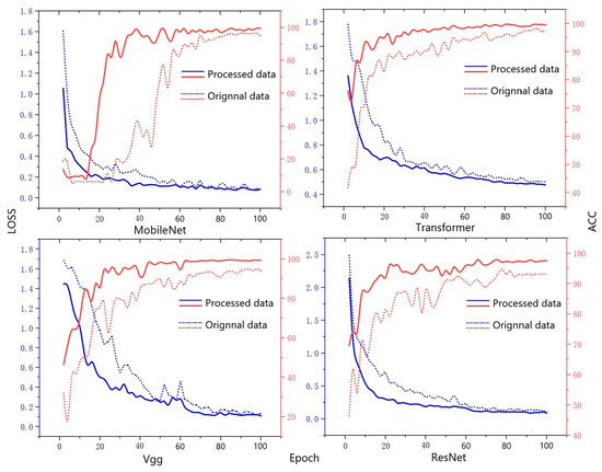 From Table 3, it can be observed that the key performance indicators of F1-score, precision, and recall demonstrate significant improvements. The models achieved an average accuracy of over 85% for both F1-score and precision, whereas recall exhibited a positive growth trend of 1% to 2% when compared to the initial state. In Figure 6 and Figure 7, it is evident that the augmented training set exhibits a smoother and more gradual performance growth compared to the original dataset throughout the model training process. The average increase in accuracy (ACC) across different models surpasses 2.7%, and the performance on the test set remains satisfactory. Upon analyzing the confusion matrix, it becomes intuitive that most categories are predicted with high accuracy; however, there exist certain categories that are challenging to categorize and are thus misclassified to a certain degree. Overall, the improvement measures implemented in this study demonstrate substantial progress across various metrics, thereby offering a referential direction for optimizing and addressing specific category identification challenges.