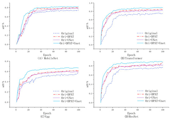 As shown in Figure 8 and Figure 9, the experimental findings reveal that the combined model incorporating both the DPAT and U-Net components (Original + DPAT + U-Net) outperforms all other experimental models in terms of recognition efficacy; the average accuracy (mAP) of the two sets is approximately 85% and 80%, respectively. mAP values improved by about 8.5% compared to the control group that relied only on the basic model. Of particular note is the fact that while models employing either a single DPAT enhancement strategy or the standalone U-Net architecture do exhibit some level of performance improvement over the original model, such enhancements are relatively less substantial when juxtaposed with those achieved by the composite model.