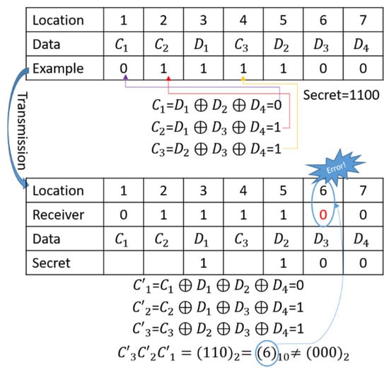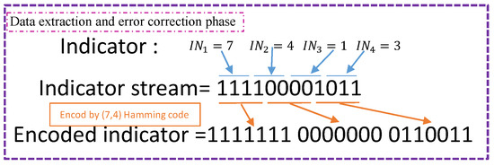 Figure 4, the indicators are first converted from decimals to three-bit binary streams and form the indicator stream 111100001011. Subsequently, we divide the indicator stream into four-bit groups and encode each group by using (7,4) Hamming coding method to obtain the encoded indicator stream. The encoded indicator stream we obtain from the example is 1111111 0000000 0110011.
