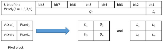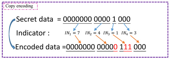 We use an efficient yet simple coding method, which we call copy encoding, to encode the secret data stream. Initially, we group successive identical bits in the secret data stream into groups. The bit values in a group can only be all 0s or all 1s. The number of bits in a group is recorded as the indicator of the group. Thus, is the indicator for the j-th group and j is the index of the group. If there are more than seven successive bits with the same value in the secret stream, we need to group them into multiple groups to guarantee that the value of is in the range of [1, 7]. The indicators recorded are used to guide the extraction of secret data. Then we encode each group of secret data stream according to the parity of . The principle of secret data encoding at this stage aims to ensure that the number of encoded bit counts in a group is an odd number and is greater than one, so that the principle of ‘majority voting rule’ can be applied to verify and correct the data in the group during the data extraction process. In case is an even number, we copy one bit of data in the group and append it to the end of the bits in the group to ensure that the count of the encoded data in the group is odd. If is an odd number and is greater than one, the encoded secret bit stream of the group is the same as the original. When a group contains only one bit, i.e., the group’s indicator , we duplicate the data twice to make the encoded group comprise three bits.