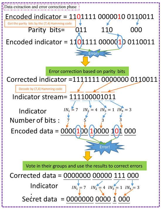 When the receiver downloads the stego image from the cloud, the receiver can read the encoded indicator stream and the encoded secret data stream directly from the LSBs of the stego image pixels. The receiver should extract the indicators first to subsequently guide the verification, correction, and extraction of secret data. The receiver needs to group the encoded indicator stream into groups and each group consists of seven bits. Subsequently, the receiver recalculates the three-bit check code in each group using Equations (4)–(6) and performs the process of data verification and error correction using (7,4) Hamming codes which were detailed in the Related Work section.