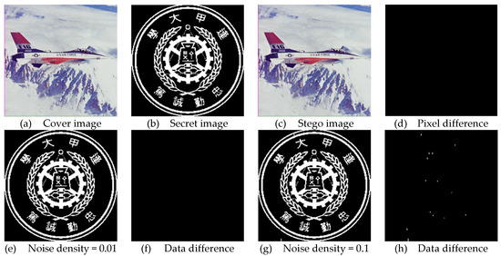 Figure 6 shows the visualization results of the proposed scheme before and after embedding the encoded secret image into the cover image. As can be seen from (a) and (c), it is difficult for a malicious user to find out that (c) is an image with the embedded secret image (b). (d) is the pixel difference between the stego image and the original cover image. From (d), we can find it is almost impossible for people to find out the difference between the original cover image and the stego image at the pixel level. In general, people will treat the stego image as a cover image and not pay much attention to it. If a malicious user still chooses to attack the stego image by adding salt and pepper noise to the image in order to destroy the information of the image, the secret data image encoded using the proposed method can be mostly correctly extracted. Salt and pepper noise, randomly appearing as white or black dots, is a common type of noise in images. These noises may be black pixels in bright areas, white pixels in dark areas, or both.