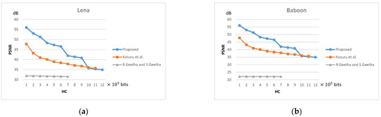 Figure 7, the figure illustrates the PSNR performance of several methods when embedding varying amounts of secret data in two test images. It is evident that the proposed method imposes less damage to the images and achieves higher PSNR values when embedding fewer secret data. The proposed scheme uses LSB replacement for secret data embedding. There can be one or two LSBs needed to complete the data embedding and check information depending on the data amount. When the embedded data are less, the required checking information is less. The embedding method used in [