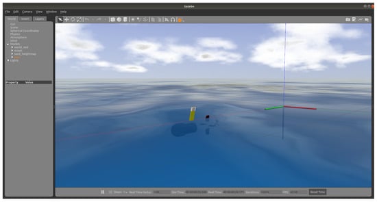 It should be noted that the basic reinforcement learning algorithm used in this paper is soft actor–critic (SAC) [24]. Emphasizing recent experience (ERE) [25] is a non-policy sampling method is used in the SAC algorithm. At the same time, the proximal policy optimization (PPO) algorithm [26] and the SAC with prioritized experience replay (SAC-PER) [27] are used as the baseline algorithm. The simulation experiment is implemented on the robot operating system (ROS) and Gazebo simulation platform, in which the AUV model is built and the relevant coordinate system definitions, can be referred to in papers [28,29,30]. The simulation platform built is shown in Figure 1. The green line is the x-axis, the red line is the y-axis, and the vertical blue line is the z-axis.