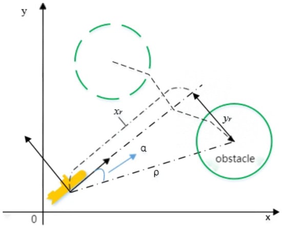 In this section, and represent the relative distances on the x-axis and y-axis, respectively, while and represent the absolute distances on the x-axis and y-axis. When rotating around the z-axis, the values on the z-axis do not change, so only the related rotation matrices for the x and y axes are listed here. Next, we can calculate the relative distance between the AUV and obstacles using Formula (2).