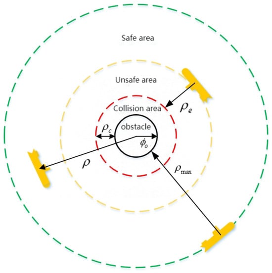 where is the distance between the current position of AUV and the center of the obstacle, is the radius of the obstacle, and is the maximum distance that can be detected by the sensor equipped with the AUV, as shown in Figure 3. in the figure is the range where the AUV will collide with the obstacle. indicates the range of unsafe areas. The distance defined after combining the event-triggering mechanism can then be expressed according to Equation (6):