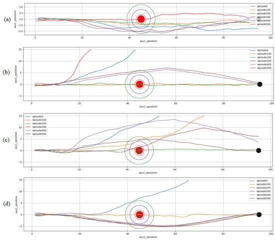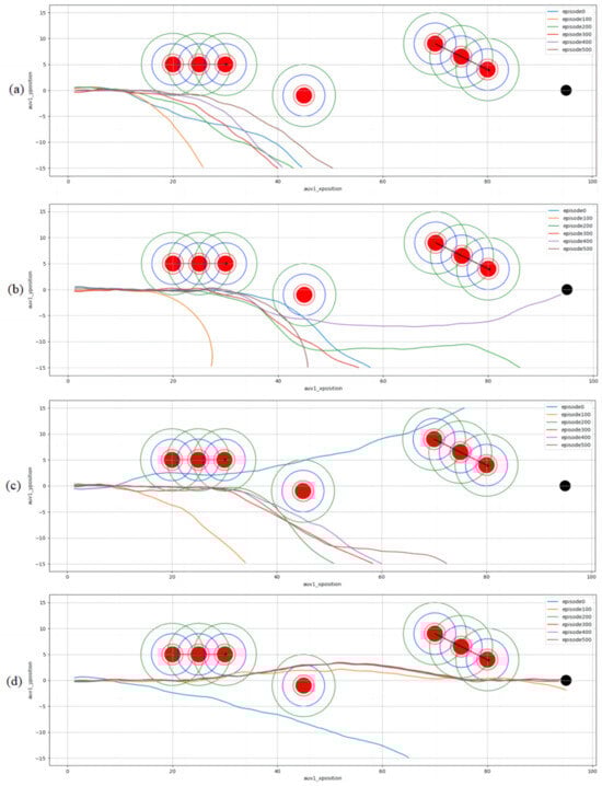During the single obstacle avoidance task training, the obstacle avoidance performance using the ET-PPO (a), ET-SAC (b), ET-SAC-PER (c), and ET-SAC-ERE (d) methods is illustrated in Figure 4. The black dot represents the target location, with a center coordinate of (95, 0) and a radius of 1 m. It means that reaching within a 1 m radius around the center is considered a successful target approach. The red dot represents the obstacle model, with a center coordinate of (45, 0) and a radius of 1.5 m. The green circle represents the detection range of the agent, with a radius of 6 m. The blue circle indicates the unsafe area, with a radius of 4 m, while the red circle represents the collision area, with a radius of 2 m.