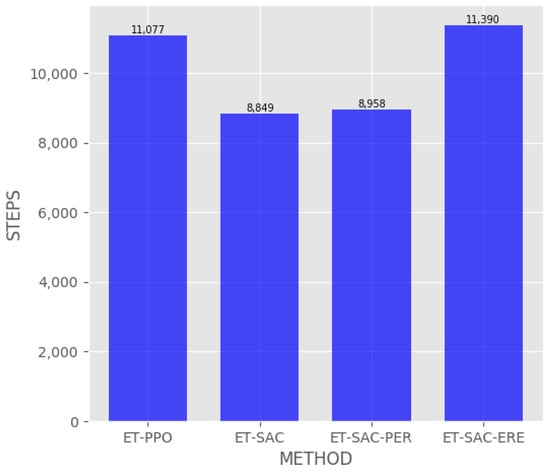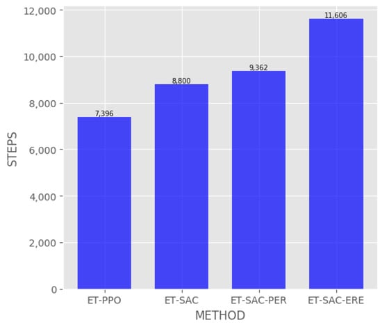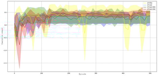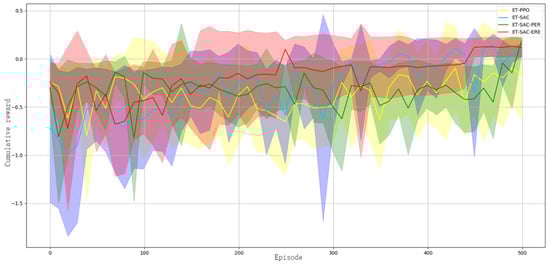 Using the defined reward function, the average reward per step for each episode is calculated. The shaded area represents the 0.95 confidence interval, and the bold line indicates the average performance, as shown in Figure 15. The average cumulative reward of ET-PPO fluctuates widely, and the overall performance is unstable and effectively poor. The curves for ET-SAC and ET-SAC-PER are relatively similar, but both fail to achieve high rewards. They can’t finish the designated tasks. At episode 150, ET-SAC-ERE manages to reach higher average rewards. Then the curve can be more smoothly maintained in a high reward range. The average value of ET-SAC-ERE is the highest among all agents, which is consistent with the fact that ET-SAC-ERE is more likely to learn effective strategies in experiments to eventually reach the target position while avoiding obstacles.