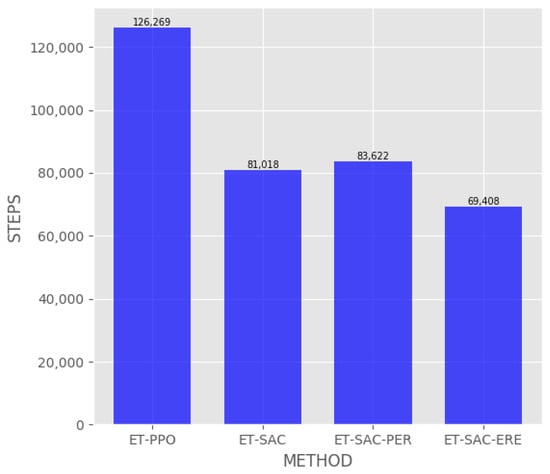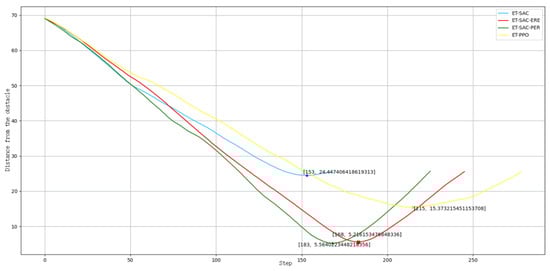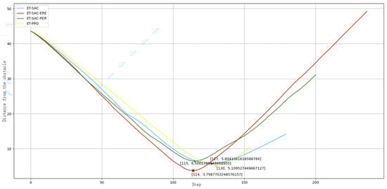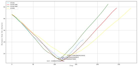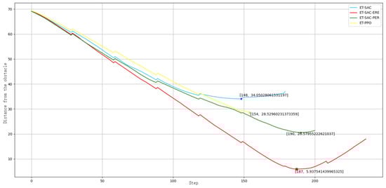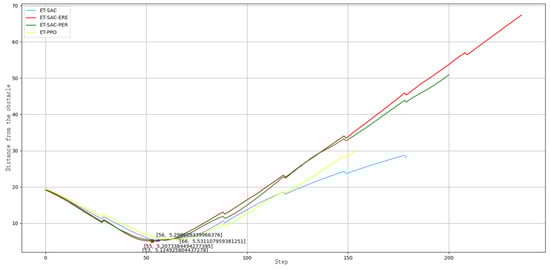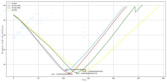 This section analyzes the training process of multiple obstacle avoidance tasks using ET-PPO, ET-SAC, ET-SAC-PER, and ET-SAC-ERE. We depict the distance variations between the agents and obstacles as shown in Figure 10, Figure 11 and Figure 12. Similar to the single obstacle avoidance task, only the distance variation data corresponding to Figure 8 are presented. It is observed that in ET-PPO, ET-SAC, ET-SAC-PER, and ET-SAC-ERE, the closest distances to obstacle 1, obstacle 2, and obstacle 3 are 4.8705 m, 4.3699 m, and 5.2162 m, respectively. It means they are all in a safe area. The agents can effectively navigate through the safe area to avoid obstacles. However, it is noted from Figure 8 that some agents fail to reach the target. Table 2 provides the distances between ET-PPO, ET-SAC, ET-SAC-PER, and ET-SAC-ERE and obstacles in three experiments. The table also records the number of successful experiments. It can be seen that ET-SAC-ERE can reach the target point more effectively while avoiding obstacles compared to the other methods. ET-PPO successfully completes the mission once, while others enter unsafe areas or collide with obstacles. ET-SAC and ET-SAC-PER fail in all three attempts, managing to avoid the third obstacle but failing to reach the target successfully. Therefore, the mean of the minimum value of obstacle 3 is also relatively larger. The total number of steps for each deep reinforcement learning convergence to a fixed policy is recorded in Figure 13. ET-PPO, ET-SAC, and ET-SAC-PER stop training early due to the inability to converge to a successful policy, so they have fewer steps compared to ET-SAC-ERE.