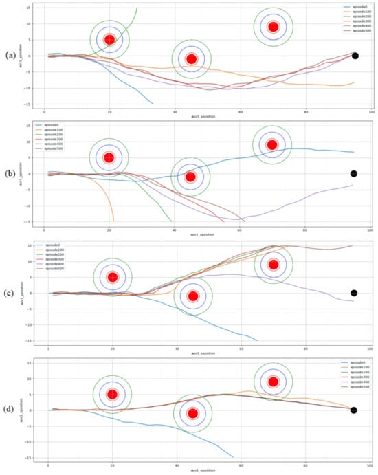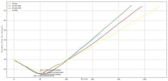 Figure 14 illustrates the obstacle avoidance performance using the ET-PPO (a), ET-SAC (b), ET-SAC-PER (c), and ET-SAC-ERE (d) methods. In the figure, the meaning of each circle is the same as before. At episode 0, all reinforcement learning methods trigger the constraint and stop training. Figure 14a depicts that in the multiple dynamic obstacle avoidance task, the ET-PPO agents consistently attempt to learn strategies to navigate around obstacles but do not succeed. Figure 14b shows that ET-SAC agents begin attempting to avoid all obstacles around episode 100, briefly entering the safe area around episode 400 but fail to learn a stable strategy. It is unable to successfully complete the task. Figure 14c shows that ET-SAC-PER agents begin to attempt to avoid all obstacles around episode 100 but fail to reach the target while avoiding obstacles. Figure 14d indicates that ET-SAC-ERE agents pass through unsafe areas to avoid obstacles and reach the target around episode 100. By episode 200, the agent has learned a fixed strategy that can pass within 4 m of the obstacle and finally reach the target position. The specific distance variations between each agent and obstacle will be further detailed in the following content.