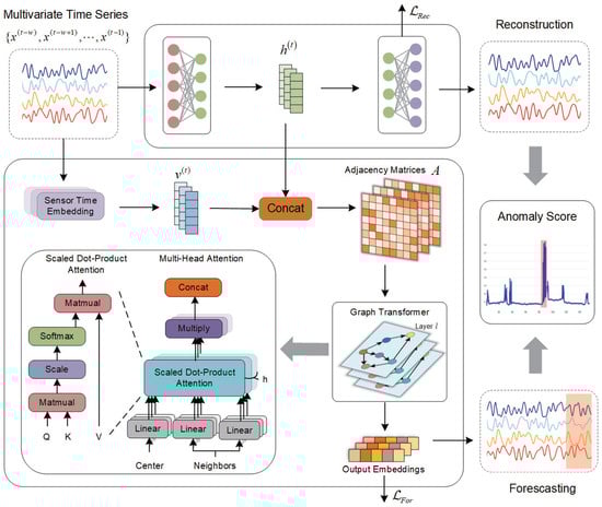 In recent years, thanks to the advancement of deep learning techniques and their powerful data representation capabilities, unsupervised anomaly detection that relies on deep learning techniques has demonstrated significant advantages over traditional methods. These methods can effectively capture complex hidden features and temporal dependencies, enhancing their predictive and analytic capabilities. In the multivariate time series anomaly detection field, there are also many methods for anomaly detection with neural networks. For instance, Autoencoders (AEs) [] and Generative Adversarial Networks (GANs) [] are extensively employed in reconstruction-based anomaly detection. These methods reconstruct normal data patterns and utilize reconstruction errors as anomaly scores. Forecasting-based methods utilizing Long Short-Term Memory (LSTM) [,] or Gated Recurrent Units (GRUs) are commonly used to mine temporal dependencies. However, these methods face challenges when dealing with high-dimensional sensor data, as they fail to explicitly capture the topological structure between sensors.
