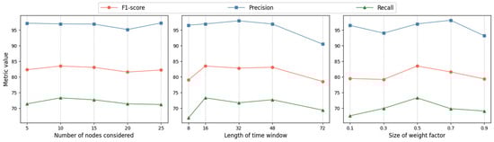 - Number of nodes considered: The model’s performance is generally consistent across the set values, achieving optimal results when set to 10. To optimize computational efficiency, we set it to 10.