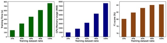 Experiments were conducted using the SWaT dataset to assess model training time and GPU memory usage across varying dataset sizes. Random continuous subsamples of 20%, 40%, 60%, 80%, and 100% of the dataset were used as training sets for experiments. The results, as shown in Figure 3, display the average training time per epoch, GPU memory usage, and F1-score trends with varying proportions of training data. It was observed that an increase in dataset proportion resulted in elevated training times and resource consumption per epoch, while the F1-score demonstrated an initial increase followed by a stabilization. These observations suggest that our model effectively balances dataset scale and performance. Practical applications can benefit from optimized training strategies to reduce runtime and resource consumption.