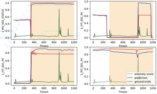 The dataset WADI simulates three subprocesses of the water distribution system: P1, P2, and P3. These subprocesses involve water inflow, taking water from P1 for distribution to users, and returning excess water to P1. Moreover, the system contains 127 sensors spread across the three subprocesses. The first number of each sensor name is used to identify the sub-process where the sensor is located. For example, the sensor 1_MV_001_STATUS is in P1. Within each subprocess, the sensors are intricately linked. If one subprocess experiences an attack or failure, it can trigger a chain reaction that impacts the operation of the entire system. Concerning the malicious act of opening the motorized valve 1_MV_001_STATUS, when the motorized valve 1_MV_001 that controls the water tank’s level is maliciously opened, it results in increased water flow and rising liquid levels in the tank. The change was detected by 1_FIT_001_PV, which measures the water flow, and 1_LT_001_PV, which monitors the water tank’s liquid level, so their readings correspondingly increased. However, this attack will not only affect the sub-process (P1) but also further affect the sub-process P2. Since the raw water from P1 is transferred to P2 through the transfer pump, the flow indicator transmitter 2_FIT_001_PV also showed an increase, and without doubt, the outlet pressure measured by 2_PIT_001_PV also changed. The anomaly scores of the attacked sensor and other sensors are affected by the attack as shown in Figure 4, which is consistent with ground truth operation logs. The comparison of sensor values predicted by our methods with the actual observations reveals that when one sensor is compromised, related sensors are affected, even if they are not directly attacked.
