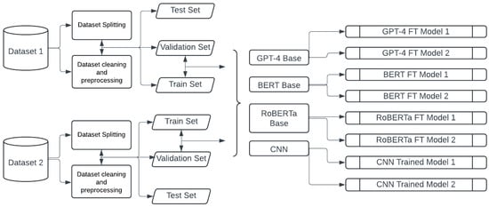To achieve the objectives outlined in this paper, it was crucial to adopt a specific research methodology due to the extensive and intricate processes involved. This methodology has been carefully selected to support not only the implementation of data cleaning techniques and prompting engineering but also the following deployment and refinement of the models. The detailed structure for these processes is explained in the subsequent subsections, furnishing an exhaustive and cohesive approach for the investigation. To enhance comprehension, the procedure is visually represented through two flow charts Figure 1 and Figure 2 crafted with the Lucidchart software (https://www.lucidchart.com).